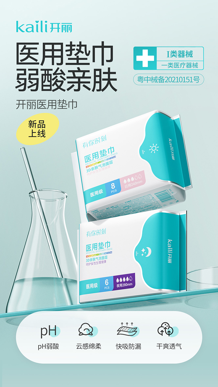 3. 醫用墊巾:類醫療器械注冊產品,醫用級弱酸親膚,3D親膚氣泡面層,呵護女性生理健康;