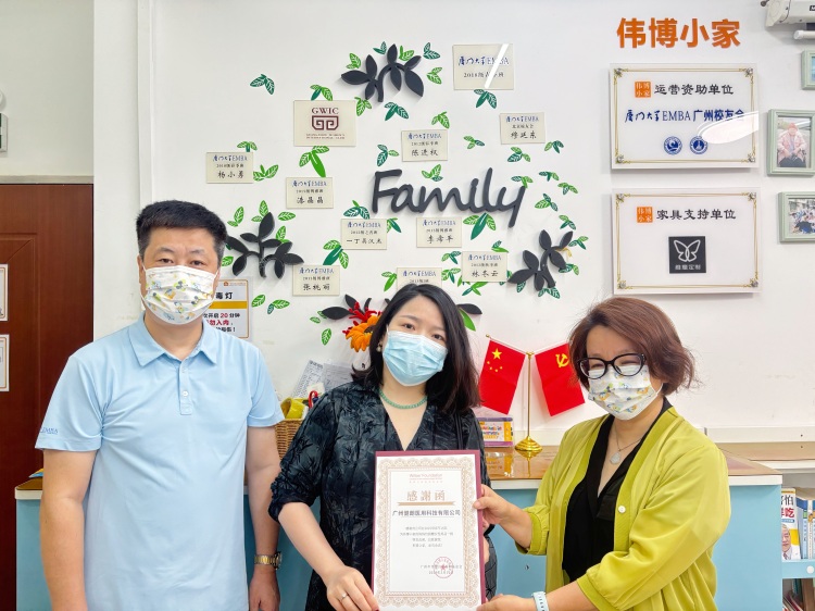 廣州市偉博兒童福利基金會秘書長(右1)向健朗醫用頒發感謝函并合影留念